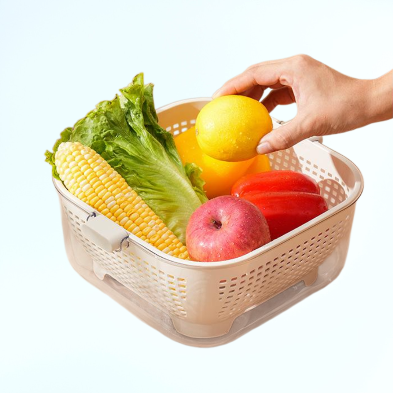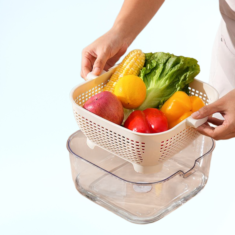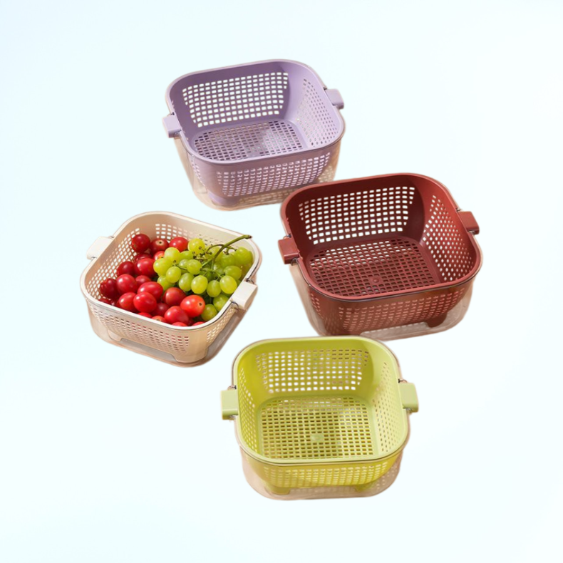 이중 구조로 물빠짐이 우수하며, 채소·과일 세척과 보관에 적합한 주방용 배수 채반 바구니